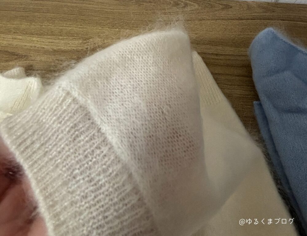 毛羽立ちに関しては、目の詰まったニットと比べると、カシミヤならではの“ふわふわとした毛”が表面にほんのりでている感じがあります。