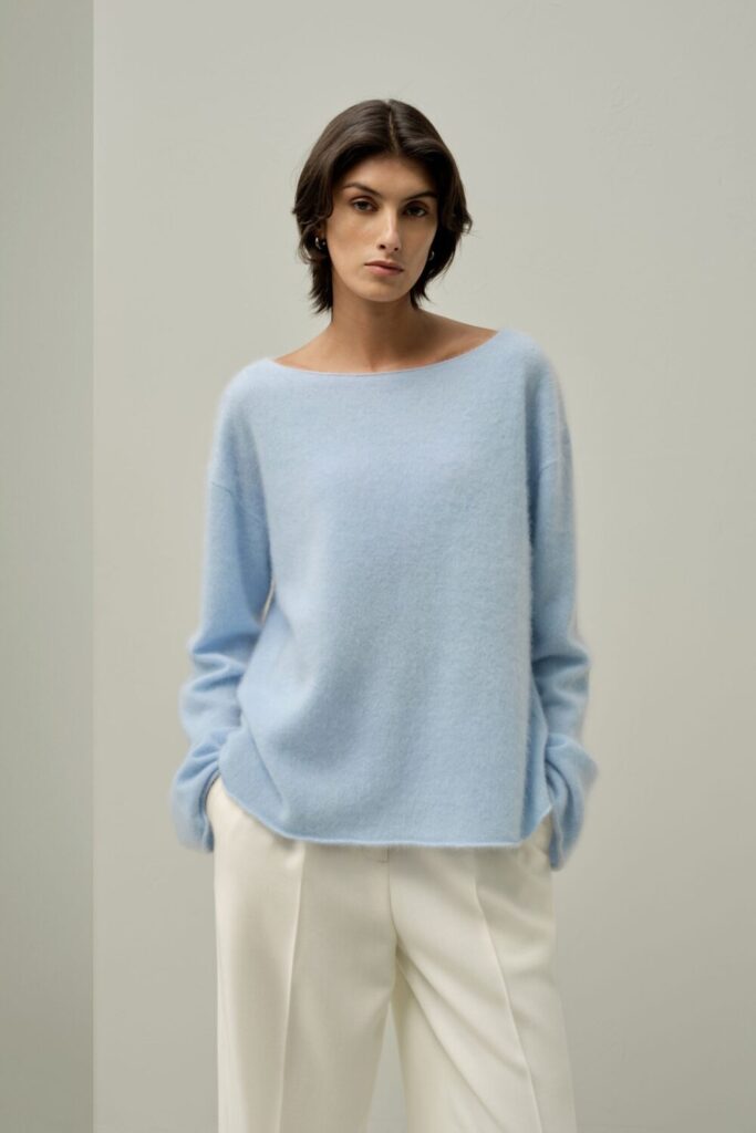 ブルーのニット(起毛カシミヤ オーバーサイズ ボートネック ニットセーター